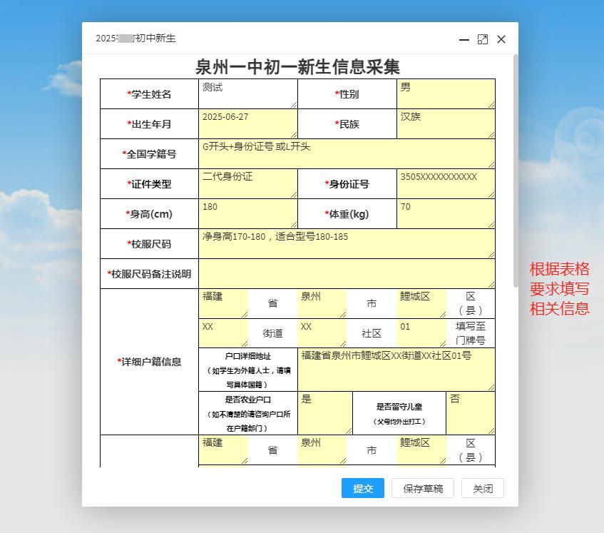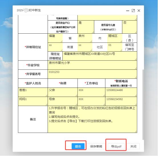 输入新生姓名和注册码(即为全国学籍号的后八位,如有学生号码中出现字母,字母统一用大写,且需在纯英文状态下输入),点击【确定】(如图一),在弹窗表格中根据表单提示填入对应的信息并点击下方【提交】(如图二),提交成功后点击下方【导出PDF】打印“泉州一中初一新生信息采集表”(如图三)。