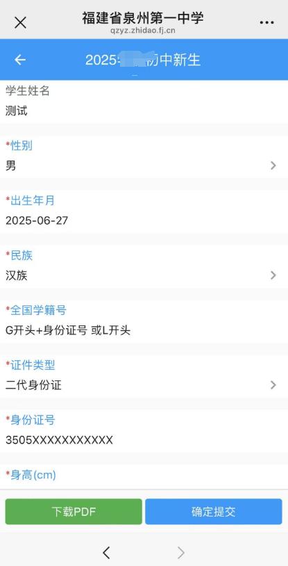 扫描下方二维码(如图四),输入新生姓名和注册码(即为身份证号后八位,如有港澳台身份证的学生,证件号码中的括号也算一位字符,字母统一用大写,括号统一用输入法中的纯英文状态下的括号),点击【确定】,在表格中根据表单提示填入对应的信息并点击下方【确定提交】(如图五),提交完成后点击【下载PDF】,导出PDF文件发到电脑上打印“泉州一中初一新生信息采集表”(苹果手机用户系统无法响应,建议通过电脑端导出打印)。
